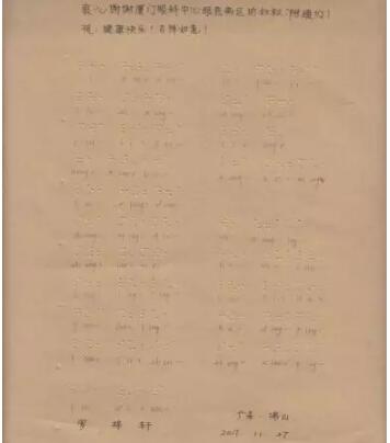 近日,厦门眼科中心眼底二病区的医生护士们收到了一封特殊的感谢信。感谢信上每个医生护士的名字,都是用盲文打出来的,下排还用铅笔标注了拼音,仔细拼读才知道这是一列医生名单:黎晓新、吴国基...