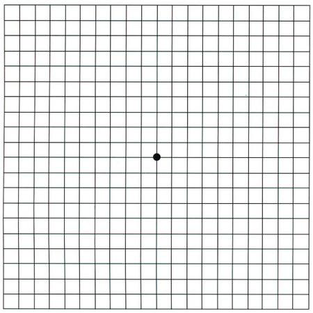 有一种简单且能够及早发现老年性黄斑变性的方法,叫做阿姆斯勒方格(如下图)。这是一个打印的正方形的小格子,类似于棋盘格,尺寸一般是15厘米X15厘米。患者可以把它贴在冰箱上,每隔一周挡住一侧眼睛看一看,如果发现自己任何一侧的眼睛看到格子变形了,就需要来看医生了。